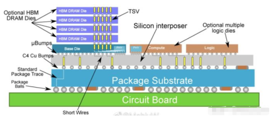 HBM是一种标准化的堆叠内存技术,它为堆栈内以及内存和逻辑之间的数据提供了宽通道。基于HBM的封装将内存堆在一起,并使用TSV将它们连接起来,这样创建了更多的I/O和带宽。