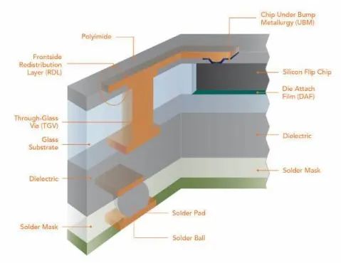 硅胶倒装芯片嵌入到玻璃衬底中,然后RDL在芯片上扇动,形成一个贯穿玻璃的通道