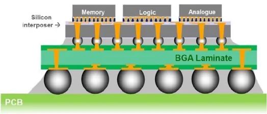 在2.5D的封装中,模具被堆放或并排放置在一个隔片的顶部,基于硅通孔(TSV)。基座是一个交互器,提供芯片之间的连接。作为传统2D IC封装技术的一个增量步骤,2.5D封装使更细的线条和空间成为可能。