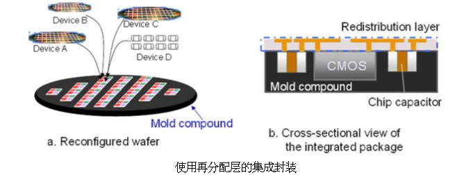 扇出型晶圆级封装是一大改进,为晶圆模提供了更多的外部接触空间。将芯片嵌入环氧模塑料内,然后在晶片表面制造高密度重分布层(RDL)和焊料球,形成重组晶片。