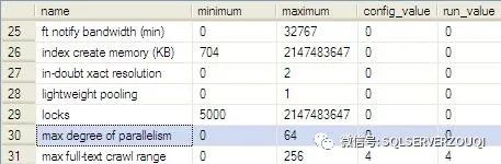 maxdop是什么呢?这是SQLServer的一个高级配置。我们可以通过sp_configure查看。如下图: