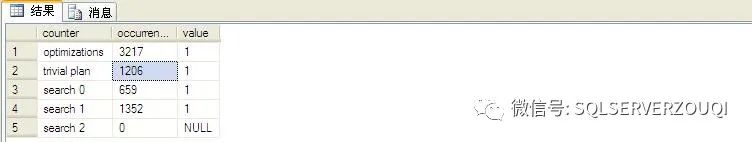 不知道大家注意到没,我上面的图查询优化器输出的是较好的执行计划。想想为什么? 如果想查看优化过程的内部情况,可以使用一下sys.dm_exec_query_optimizer_info动态管理视图。比如,下面演示证明我们这条select语句是属于普通计划。按照如下操作执行: