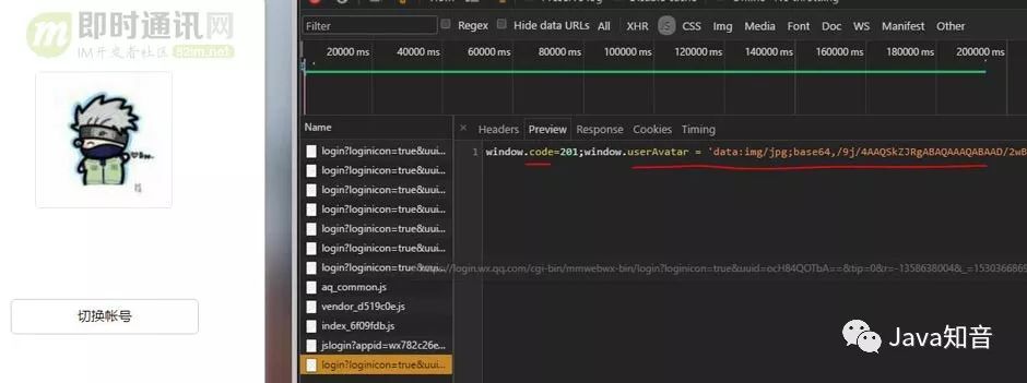 201 已扫码:如果手机已经扫码,服务器立即返回状态码和用户的基本信息 (window.code=201,window.code.userAvator="…"),-> 前端继续轮询