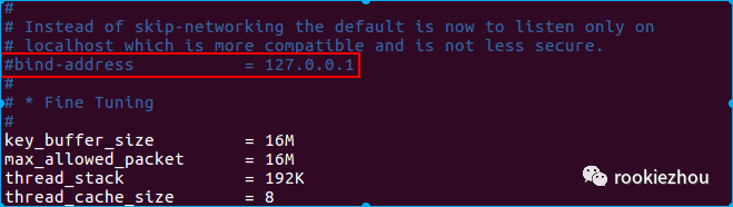 红色标注部分这里就是 MySQL 默认只能由本机访问,我们将其注释掉,注释之后最好将 MySQL 服务重启,之后再进行创建用户以及赋予新用户相应权限的操作。