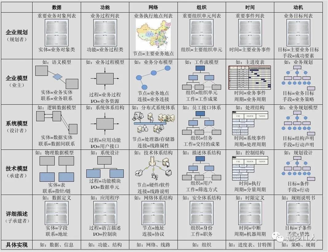 关于企业架构比较著名的是Zachman框架,它旨为信息技术企业提供一种可以理解的信息表述。它可以对企业信息按照要求分类和从不同角度进行表示。也被称为企业架构和企业信息系统结构架构。Zachman框架提炼和吸收了传统方法中的一些精髓,它是一款独立于信息企业所使用的工具的平台。它可以根据抽象规则定义企业信息的一个方面.一个框架采用了一种六行,每行中包含36个子单元的格式,这六行包括了范围,商业模式,系统模式,技术模式,组件和工作系统)其中有六列分别为谁,什么,什么时间,什么地点,为什么和如何做。