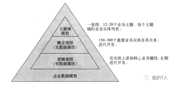 在DAMA中关于企业数据模型是分层次的,核心是主题域,其下是概念视图和逻辑视图,并且企业数据模型是自上而下构建的。