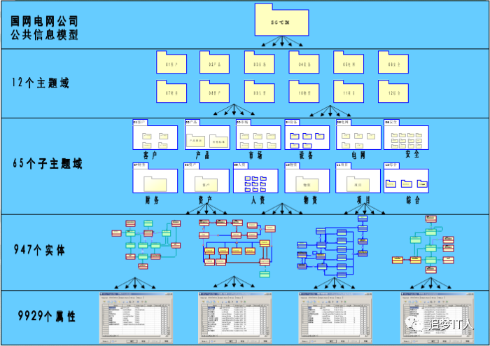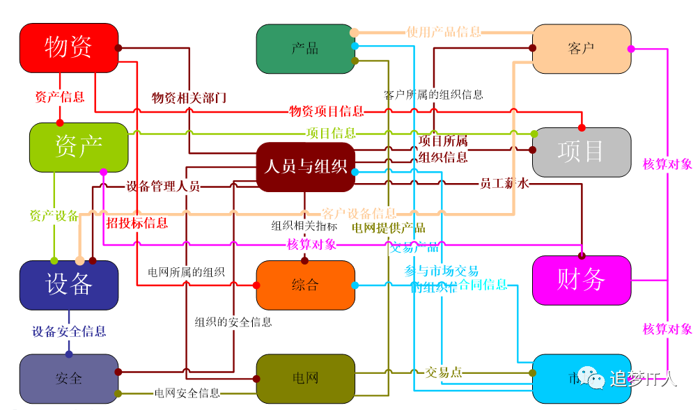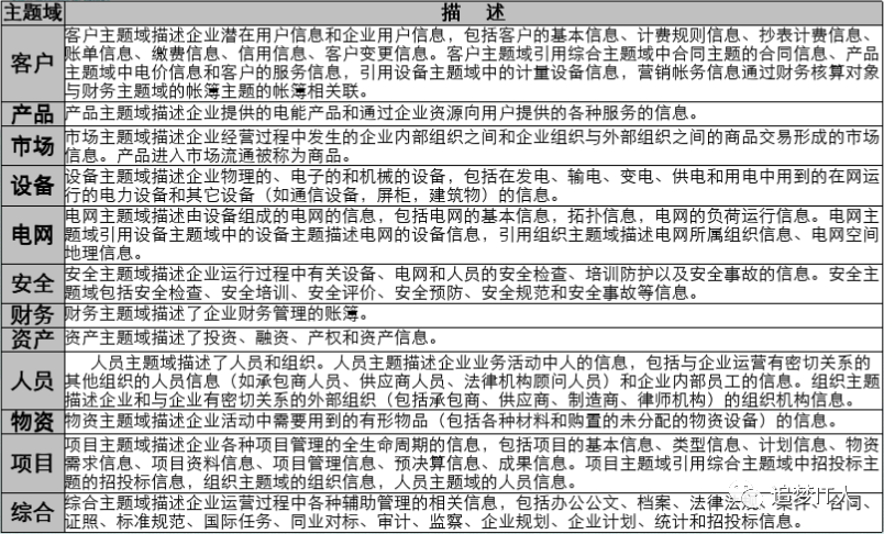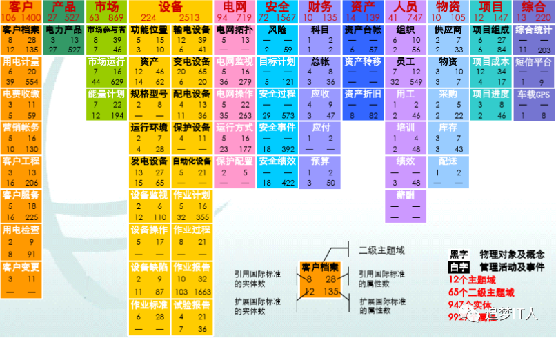上图均为从网络上收集的主题域,可以看出企业主题的构建是个极其复杂的系统工程,企业主题是分层,比如国网将企业主题分为12个主题域,在其下又包含65个二级主题域;再则,主题域构建的来源在哪里呢?首先是企业内部需求驱动,但如果在短期内构建呢?企业内部需求显然是来不及的,这时候要考虑引入国际标准和行业标准,当然财务的有财务标准,GIS的有GIS标准,设备的有设备的标准,整合起来还是有很大困难的,但至少也比从头到尾全部构建来的快,另外一个捷径是借鉴其他同类企业的标准了。