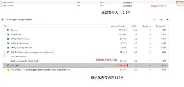 wasm 的原始文件大小为2.8M,gzip 后大小为0.72M,初始化内存为112M,大致相当于同环境下打开的QQ音乐首页占用内存的2倍,相当于打开了2个QQ音乐首页,可以说优化后的 wasm 文件已经比较符合线上使用的标准。