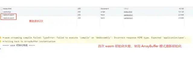 最终找到问题的原因在于,capture.js 会默认先使用 WebAssembly.instantiateStreaming 的方式进行初始化,失败后再重新使用 ArrayBuffer 的方式进行初始化。而因为很多 CDN 或代理返回的响应头并不是 WebAssembly.instantiateStreaming 能够识别的 application/wasm ,而是将 wasm 文件当做普通的二进制流进行处理,响应头的 Content-Type 大多为 application/octet-stream,所以会重新用 ArrayBuffer 的方式再初始化一次,如图9