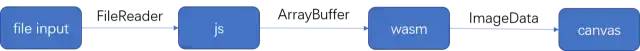 js 与 wasm 交互主要是对 wasm 内存的写入和结果读取。在从 input 中拿到文件后,将文件读取并保存为 Unit8Array 并写入 wasm 内存供代码进行调用,需要先使用 Module._malloc 申请内存,然后通过 Module.HEAP8.set 写入内存,最后将内存指针和大小作为参数传入并调用导出的方法。具体代码如下