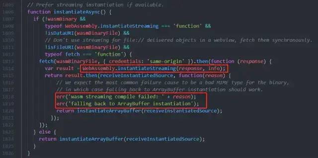再对源码进行分析后,可以找出解决此问题的办法,即通过 Module.instantiateWasm方法来自定义 wasm 初始化函数,直接使用 ArrayBuffer 的方式进行初始化,具体代码如下。