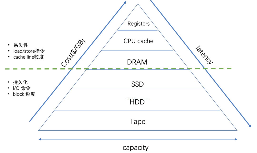 同时在这个层次结构中存在一个明显的分界线,如图中绿色的虚线。在分界线以上都是易失性的设备,掉电数据丢失,CPU通过load/store指令访问存储设备,即数据直接以cache line(64 byte)的粒度从寄存器中copy到存储设备中,或者从存储设备中copy到寄存器。而分界线以下都是可持久化的存储设备,通过向I/O控制器发送命令,以block的粒度将数据换入换出到DRAM中,然后才能直接被CPU访问。