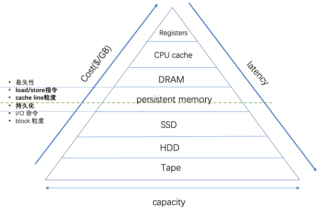 持久化内存在存储体系层次结构中的位置如下图所示,它位于DRAM与SSD之间,同时注意到它是横跨在分界线上的,它模糊了传统层次结构中内存与外存的边界,它既具有DRAM一样的数据访问方式,也具有SSD一样的持久化特性。所以可以把它当成内存或者持久化的存储使用。