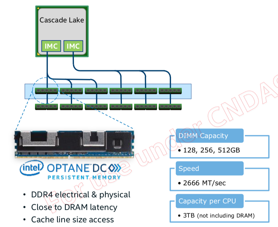 Intel optane DC persistent memory是Intel推出的基于3D Xpoint技术的持久化内存产品,其代号为Apace Pass (AEP)。AEP的物理封装为DIMM,直接插在内存插槽上,单条AEP的容量目前已经达到了512G,如上图所示,如果一半的插槽插上AEP,那么单个CPU内存容量很轻松的就可以扩展到3TB以上。IMC(integrated memory controller)与AEP之间以cache line大小的粒度传输数据,但是AEP的ECC(Error correction code) size为256字节,即AEP内部的controller与介质之间是以256字节(4个cache line)为单位进行读写。同时AEP的读写不对称,读性能明显优于写性能,所以应该避免频率的写入小对象。