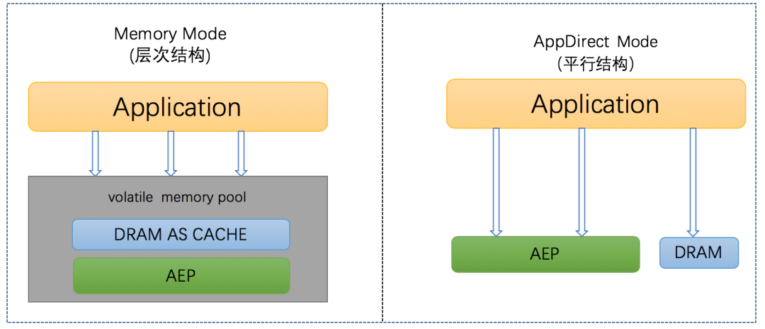 根据AEP在存储层次结构中所处的位置,自然想到的是将DRAM作为AEP的缓存,AEP中的热数据缓存在DRAM中,这也符合计算机存储系统一惯的设计思想。在这种模式下AEP和DRAM共同组成了一块对上层透明且容量更大的易失性内存,这时系统的总容量等于AEP的容量,应用无需做任何额外的修改即可使用。DRAM到AEP的缓存算法由IMC(集成在CPU里的memory controller)硬件管理。