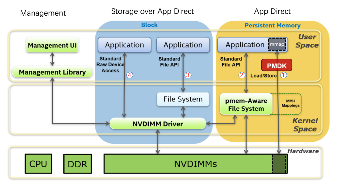 如上图中的第三、四条路径,分别对外提供block接口和标准的文件接口,应用无需额外的适配工作,这和使用SSD并没有什么区别,仅仅是延迟更小。但是这种使用方式软件栈上的开销所占的比例相当大,并不能发挥出很好发挥出AEP的极致性能,基本不用考虑这种用法,除非是已有代码确实不能改动但又想获得低延迟访问的情况。