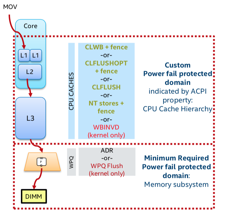 当一条store指令完成后,数据并没有立即写到DIMM介质上,很有可能还存在于cpu cache中或者Memory Controller的Write Pending Queue中,掉电后还是会造成数据丢失,也就说这里是一个异步的持久化过程。所以应用需要显示flush cpu cache和WPQ后才能说明数据确实已经持久化,当然在Intel平台上ADR模块掉电后会触发硬件中断到Memory Controller并flush WPQ中的数据到DIMM介质上。即Intel平台上关注cpu cache就好。clflush、clflushopt、clwb指令都是用于flush cpu cache, 其中clflushopt、clwb是为了提升持久化内存的flush效率新引入的,不一定所有平台都支持。其中clflush是串行flush, 而clflushopt可以并行flush, clwb与clflush类似,只是并不一定会立即失效cache line,提升后续读性能。