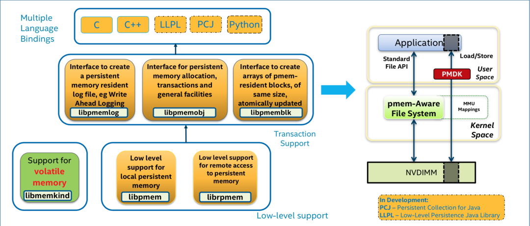 为了简化持久化内存在AppDirect下的使用,Intel开发了PMDK(Persistent Memory Development Kit)。我们可以直接在PMDK的基础上去开发自己的应用,但是这些通用的库也并不一定适合所有场景。