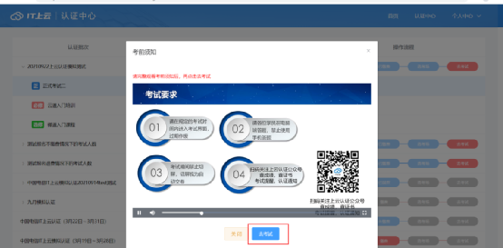 本次考试仅限电脑端参与,请通过电脑端打开考试链接。1、建议使用Chrome浏览器,电脑端输入网址https://cert.chinatelecommss.com,手机微信扫码(或验证码)登录上云认证门户网用户登录认证门户网址:https://cert.chinatelecommss.com,微信扫描二维码登录。用户登录认证门户网址:https://cert.chinatelecommss.com,页面切换至手机登录,输入手机号、验证码登录。(2)在弹出页面中选择模拟考试以及正式考试批次,选定场次后保存,考场有一次重新选择的机会。③页面播放考前须知,视频结束后点击“去考试”,跳转至考试界面。二、考试规则