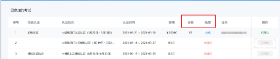 3月4日出成绩之后,通知补考人员参与补考、补考时间定于2022年3月8号上午9:30-11:30,另如因其它原因无法按时参与2日、3日认证考试,可参与补考。考试通过(60分及以上)的学员将获得“中国电信IT上云技能认证(初级)”证书,证书将于考试结束后,15个工作日内完成发放,届时学员可在证书管理查询或下载认证证书。考试未通过或未参与的学员将不予发。