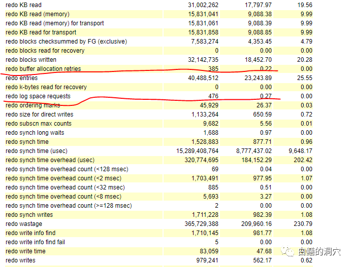 另外一个可以判断LOG BUFFER不足的因素是Log file sync的平均延时。如果log file sync很高,比如9毫秒,而Log file parallel write的平均延时只有2毫秒,那么很可能也存在LOG BUFFER设置不足的问题。