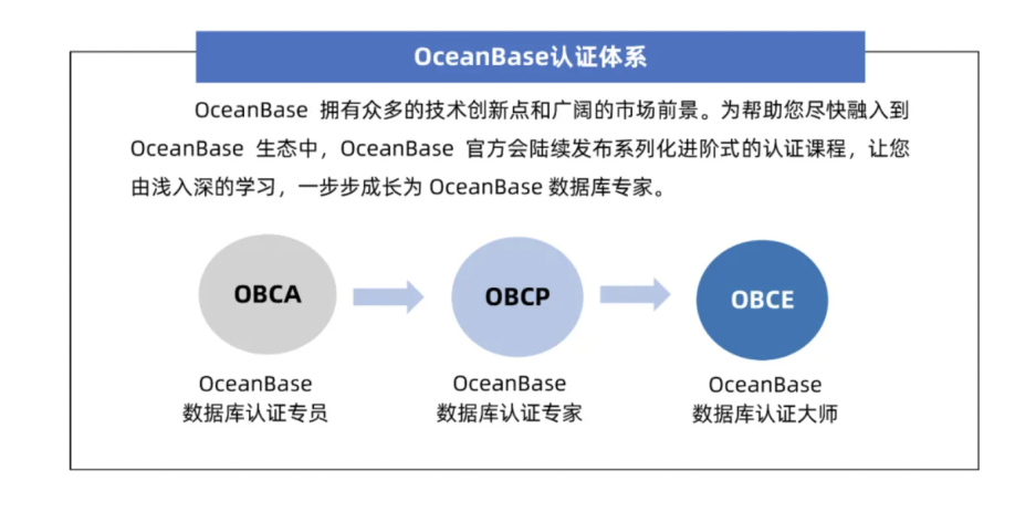 OBCA 认证是 OceanBase 体系化认证培训的第一阶段,通过学习该课程,考生将初步了解 OceanBase 数据库的基础技术架构,同时也为后续 OBCP 的课程及认证打好基础。