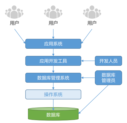 数据库系统是指在计算机系统中引入数据库后的系统。 一个完整的数据库系统一般由数据库、数据库管理系 统、应用开发工具、应用系统、数据库管理员和用户 组成。