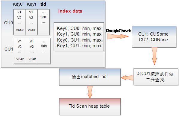 查询时如果使用psort索引扫描,会首先扫描psort索引cstore表(扫描方式和上面cstore表扫描流程相同)。在一个psort索引CU的内部,由于做了局部聚簇索引,因此可以使用基于索引键的二分查找方式,快速找到符合索引条件的记录在该psort索引中的行号,该行的TID字段值即为该条记录在cstore主表中的行号。上述流程如下图所示。值得一提的是由于做了局部聚簇索引,因此在索引cstore表扫描过程中,在真正加载索引表CU文件之前,可以通过CUDESC中的min max做到非常高效的初筛过滤。