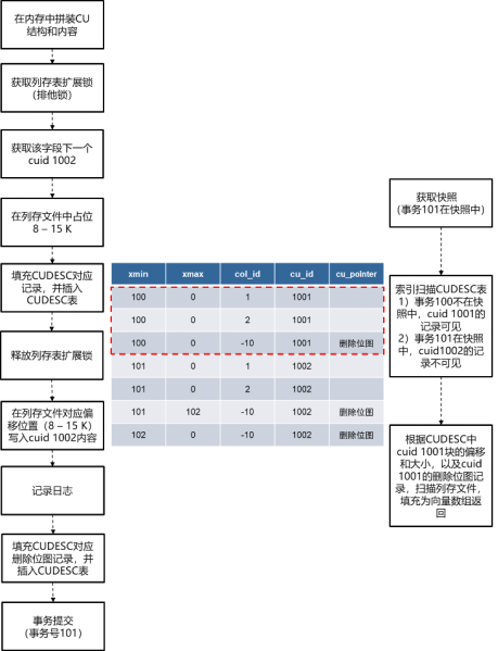 假设在上述会话2的插入事务(事务号101)执行过程中,有并发的查询操作执行。对于查询操作,首先基于col_id和cuid这两个索引键对CUDESC表做索引扫描。由于事务号101在查询的快照中,因此cuid 1002的所有记录对于查询事务不可见,查询事务只能看到cuid 1001(事务号100)的那些记录。然后,查询事务根据CUDESC记录中对应的CU文件偏移和CU大小,将cuid 1001的数据从磁盘文件或缓存中加载到局部内存中,并拼接成向量数组的形式返回。