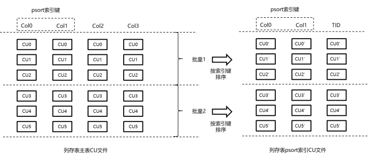 psort索引是一种局部排序聚簇索引。psort索引表的组织形式也是cstore表,该cstore表的字段包括索引键中的各个字段,再加上对应的行号(TID)字段。如图所示,将一定数量的记录按索引键经过排序聚簇之后,与TID字段共同拼装成向量数组之后,插入psort索引cstore表中,插入流程和上面cstore表插入流程相同。
