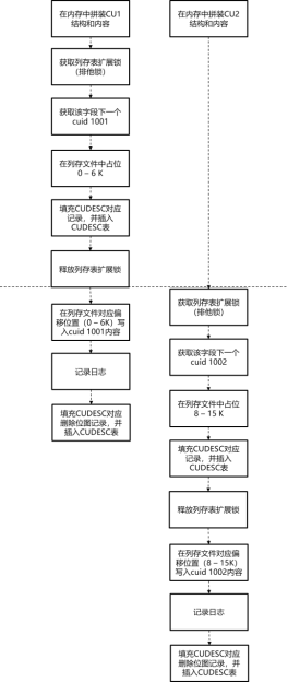 对于并发的插入操作,会话1和会话2首先分别在各自的局部内存中完成待插入CU的拼接。然后假设会话1先获取到cstore表的扩展锁,那么会话2会阻塞在该锁上。在持锁阶段,会话1申请到该字段下一个cuid 1001,预占了该cu文件0 - 6 K的内容(即cuid 1001的内容大小),将cuid的大小、偏移以及cuid 1001头部部分信息填充到CUDESC记录中,并完成CUDESC记录的插入。接着,会话1放锁,并将cuid 1001的内容写入到CU对应偏移处,记录日志,再将删除位图记录插入CUDESC表中。当会话1释放cstore表的扩展锁之后,会话2就可以获取到该锁,然后,类似会话1的后续操作,完成cuid 1002的插入操作。