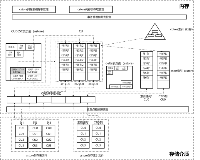cstore列存储格式整体框架如下图所示。与行存储格式不同,cstore列存储的主体数据文件以CU为I/O单元,只支持追加写操作,因此cstore只有读共享缓冲区。CU间和CU内的可见性由对应的CUDESE表(astore表)决定,因此其可见性和并发控制原理与行存储astore基本相同。