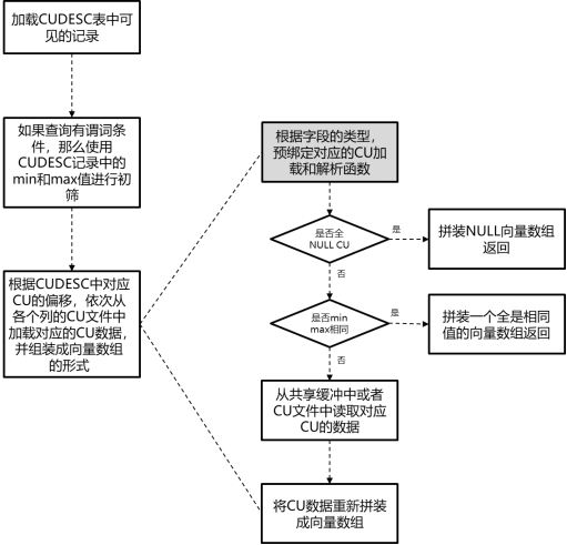 cstore表查询执行流程,可以参考下图中所示。其中,灰色部分实际上是在初始化cstore扫描阶段执行的,根据每个字段的具体类型,绑定不同的CU扫描和解析函数,主要有FillVector、FillVectorByTids、FillVectorLateRead3类CU扫描解析接口。
