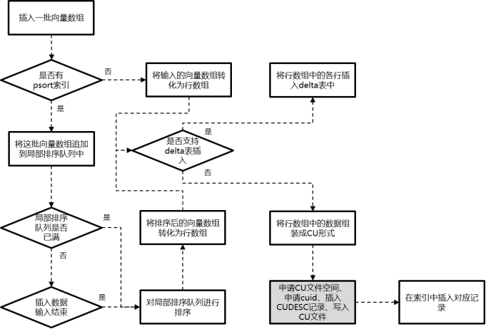 CStoreInsert::BatchInsertCommon | 将一批多行数组(最多MAX_BATCH_ROWS行)插入cstore表各个列的CU文件中、插入对应CUDESC表记录、插入索引 |