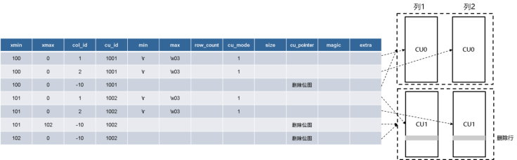 可见,cstore表的可见性依赖于对应CUDESC表中记录的可见性。一个CUDESC表的结构如下表所示,其与CU的对应关系如下图所示。