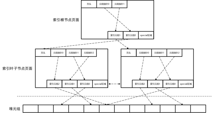 当前openGauss版本中,每个B-Tree的页面采用和行存储astore堆表页面基本相同的页面结构。页面间按照树形结构组织,分为根节点页面、内部节点页面和叶子节点页面。其中,根节点页面和内部节点页面中的索引元组不直接指向堆表元组,而是指向下一层的内部节点页面或叶子节点页面;叶子节点页面位于B-Tree的最底层,叶子节点页面中的索引元组指向索引键值对应的堆表元组,即存储了该元组在堆表中的物理位置(堆表页面号和页内偏移)。