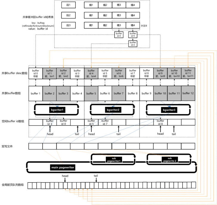 (3) buf_id_start为该bgwriter负责的共享内存区域的起始buffer id,该区域长度通过“g_instance.attr.attr_storage.NBuffers / g_instance.attr.attr_storage.bgwriter_thread_num”得到。