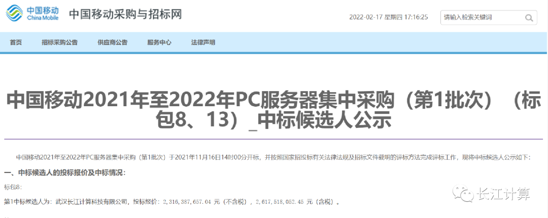 2月17日,中国移动公示了《2021年至2022年PC服务器集中采购(第1批次)(标包8、13)》的中标候选人名单,长江鲲鹏整机伙伴 — 长江计算以27.78%的份额,成为标包8第一中标候选人。