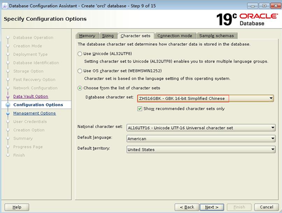 源库字符集为ZHS16GBK,所以建立新库到此处时也选择ZHS16GBK。