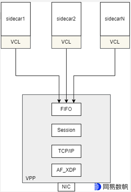 为了兼顾到性能和资源占用,我们选择VPP作为用户态协议栈。VPP作为独立进程实现用户态协议栈,并提供轻量级的VCL动态库供sidecar集成以实现socket接口的劫持,VPP和VCL之间通过共享内存进行通信。