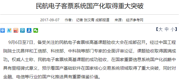 2017年,《经济参考报》:“本次电子客票系统国产成功,创造了大型交易系统采用国产基础软件全面替换国外商业软件的先例,对中国民航核心信息平台的升级换代和网络安全保障具有重要的里程碑意义。”