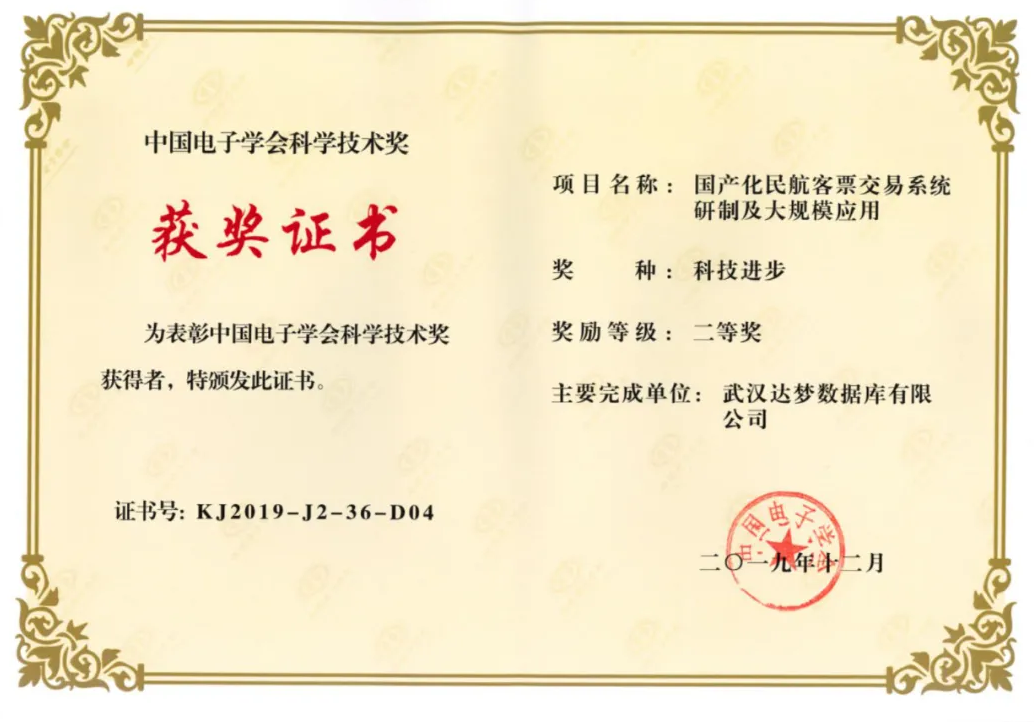 2019年,达梦主要参与的“国产民航客票交易系统研制及大规模应用”项目获得中国电子学会科学技术奖科技进步二等奖。