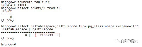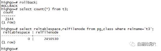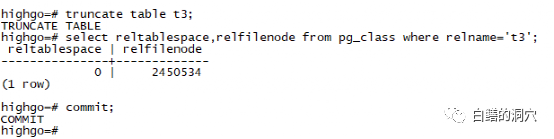 数据又回来了,而且relfilenode又恢复成truncate之前的了。和Oracle不同,PG的truncate操作是可以回滚的。从PG的官方文档上我们也可以看到,truncate操作是transaction-safe的,这一点从我们的实验上看是完全吻合的。