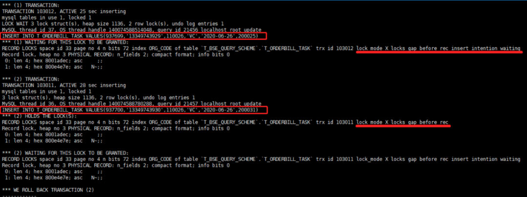 l (2) WAITING FOR THIS LOCK TO BE GRANTED中lock_mode X locks gap before rec insert intention waiting同(1)TRANSACTION等待加插入意向锁