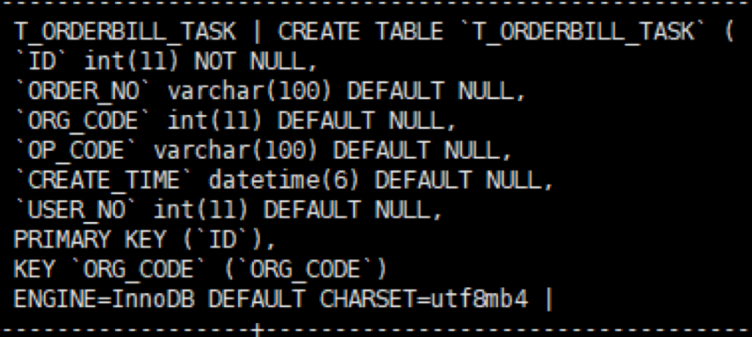 从日志中我们可以看出死锁发生在表T_ORDERBILL_TASK上而且是两条相同类型的针对表T_ORDERBILL_TASK插入的insert语句!检查T_ORDERBILL_TASK表结构如下: