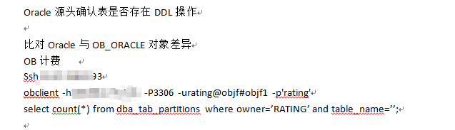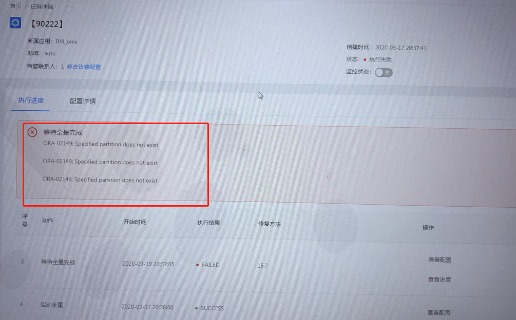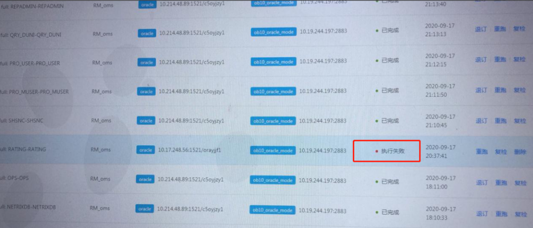 因oracle源端数据库中分区或表做了ddl删除操作,导致数据迁移过程中找不到分区或表。将ob端多余的分区手工删除,重新发起迁移任务复检就可以恢复正常