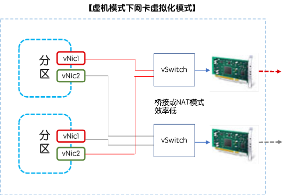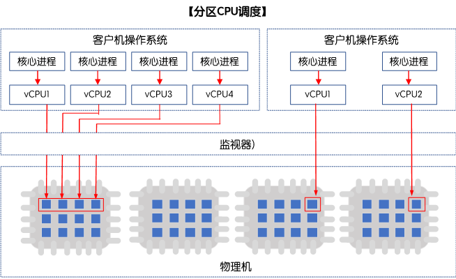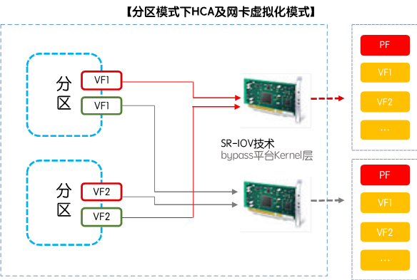 『分区』模式是介于物理服务与传统虚拟化之间的一种资源虚拟化分配、使用方式,有机实现资源与性能的平衡,其与传统虚拟化的最大的区别在于:传统虚拟化技术,通常基于vCPU模式进行资源调度,较少将vCPU与物理内核心建立一对一的映射关系;而分区模式锁定了CPU物理核资源,同时预占了物理内存模式,避免频繁线程切程及内存申请,在网卡及HCA卡层面,采用SR-IOV硬件虚拟化技术,保证各分区数据通讯的低时延及QoS。