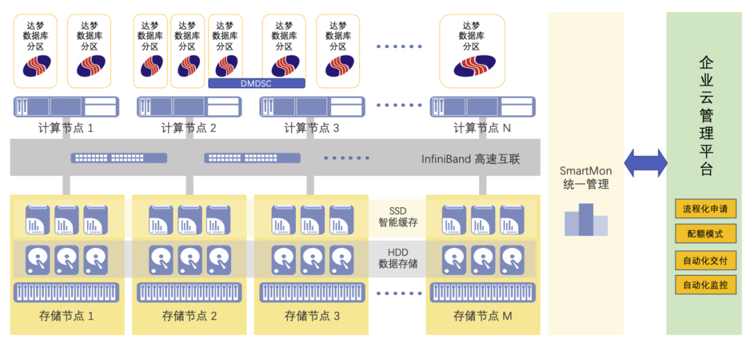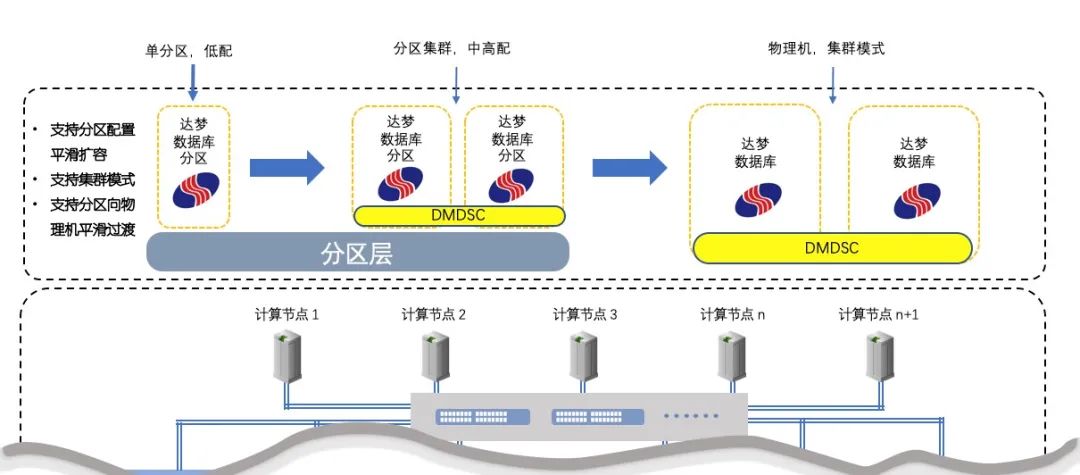 数据库一体机是承载高并发、高IO的重负荷数据库的一件利器,其核心技术是基于IB或RoCE无损交换机通过RDMA协议实现节点间内存数据直接快速交换,但其通常用于Oracle数据库场景。准确地说,单独纯采用服务器部署MySql、Postgresl、达梦等开源、国产数据库很难使用这种高速协议,难以充分发挥硬件全部性能,但如果通过某个平台架构将分区技术与高速协议技术相结合,再用于部署达梦数据库,后期随着数据库技术能力及业务需求的提升可不断加大分区资源直至采用物理计算节点部署,则集约性带来的性价比及后续平滑升级这两方面痛点就能迎刃而解。