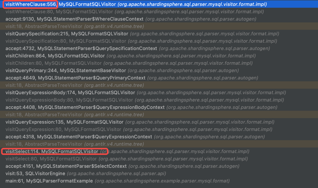 负责该 SQL 的访问任务,通过 DEBUG 代码我们可以清晰地看到本次访问的执行路径,如下图所示。Visitor 对语法树的各个部分进行了遍历,ANTLR4 会根据定义的语法规则对各个节点的访问生成默认方法。Apache ShardingSphere 对关键方法进行了覆盖,从而完成 SQL 的格式化功能。