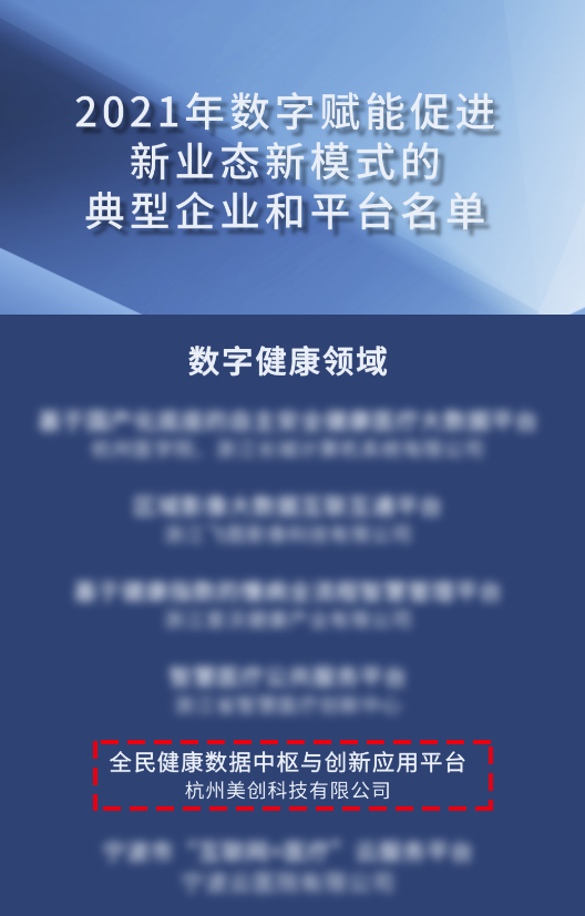 近日,根据《浙江省数字赋能促进新业态新模式发展行动计划(2020-2022年)》相关要求,经主管部门推荐、专家评审、专题讨论,浙江省发展和改革委员会公布【2021年度浙江省数字赋能促进新业态新模式的典型企业和平台名单】,美创科技“全民健康数据中枢与创新应用平台”成功入选。